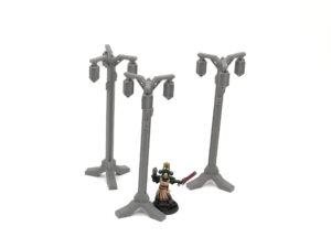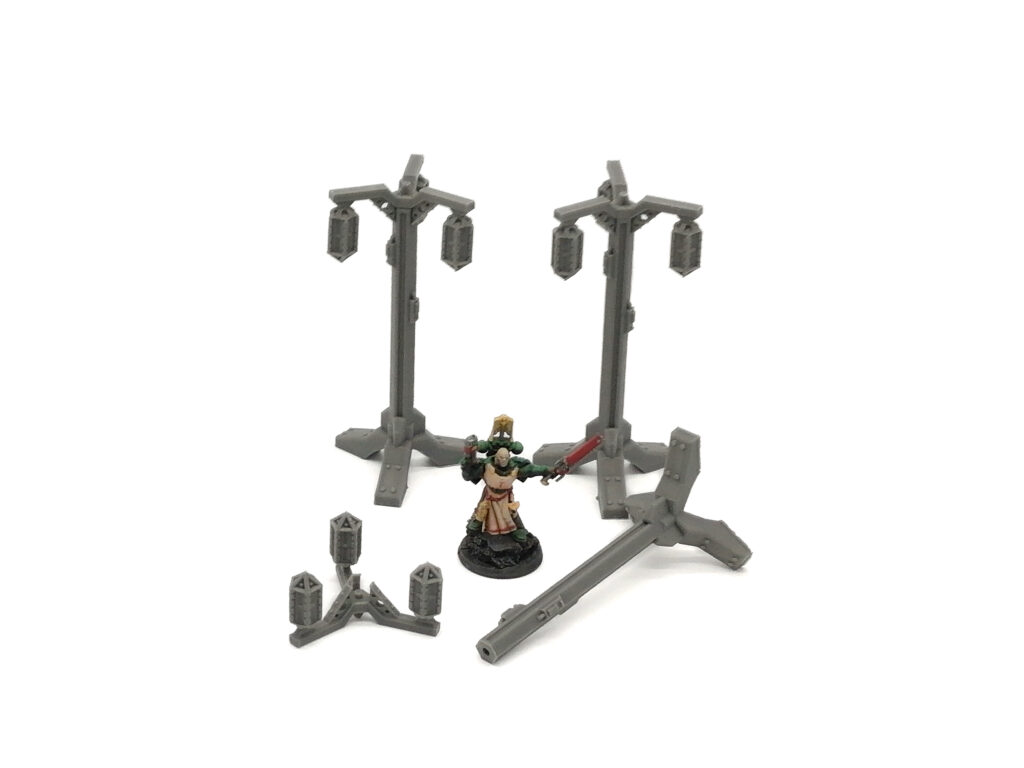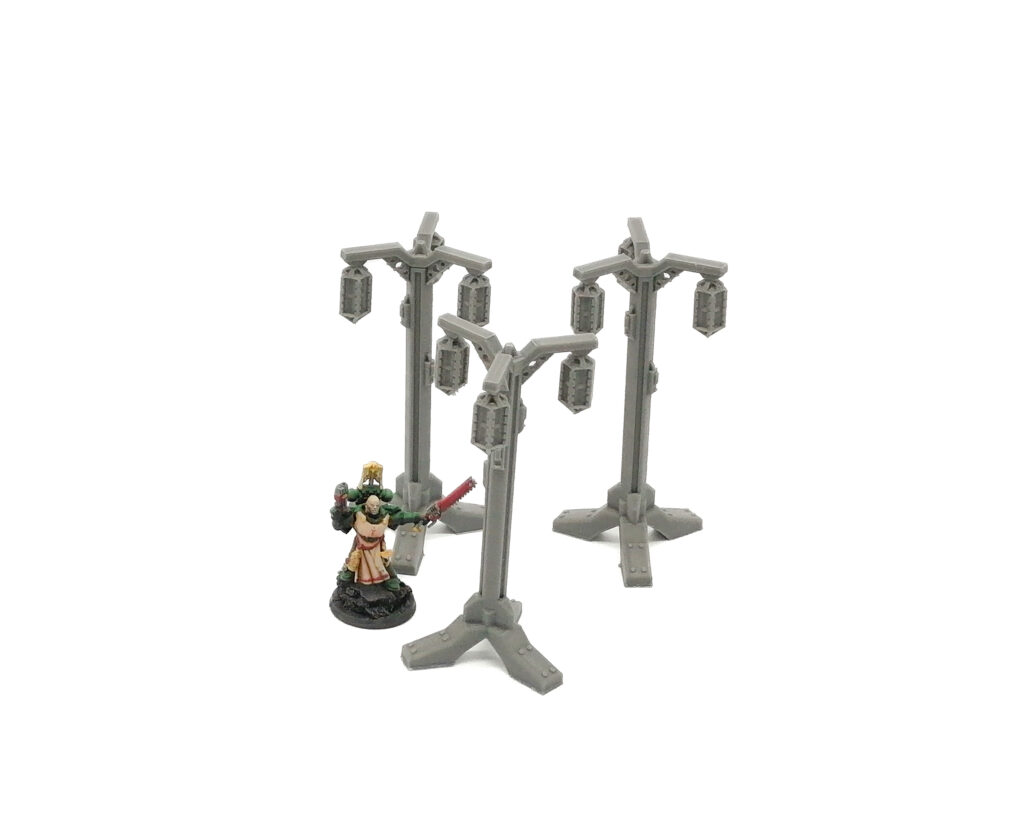 A set of 3 free standing lamp post / lighting fixtures for a urban or industrial settings suitable for any science fiction table top games.