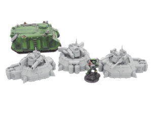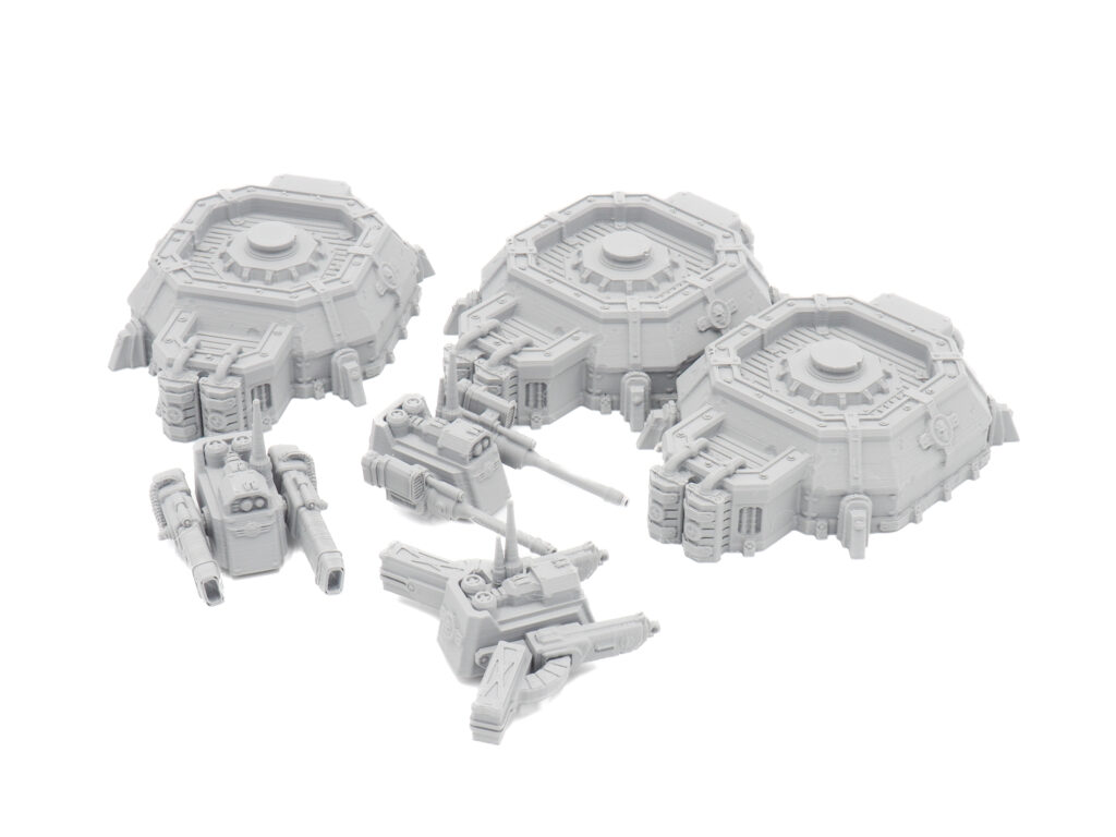 The Grimdark Defence Turret set inspired by a popular RTS game. A thematic set of automated sentry guns with multiple gun attachments.