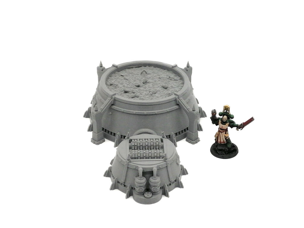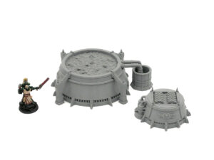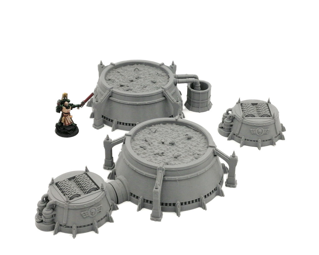 A Grimdark food processing silo's with back tank and/or shredders. Designed as suitable for any Sci-Fi tabletop game.