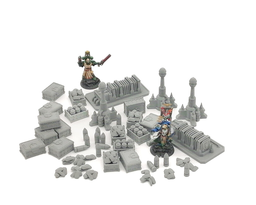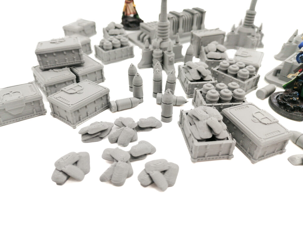A set bundle of scatter terrain from the Grimdark Stronghold set by War Scenery. Consisting of shells, sandbags, generators, lanterns and boxes.