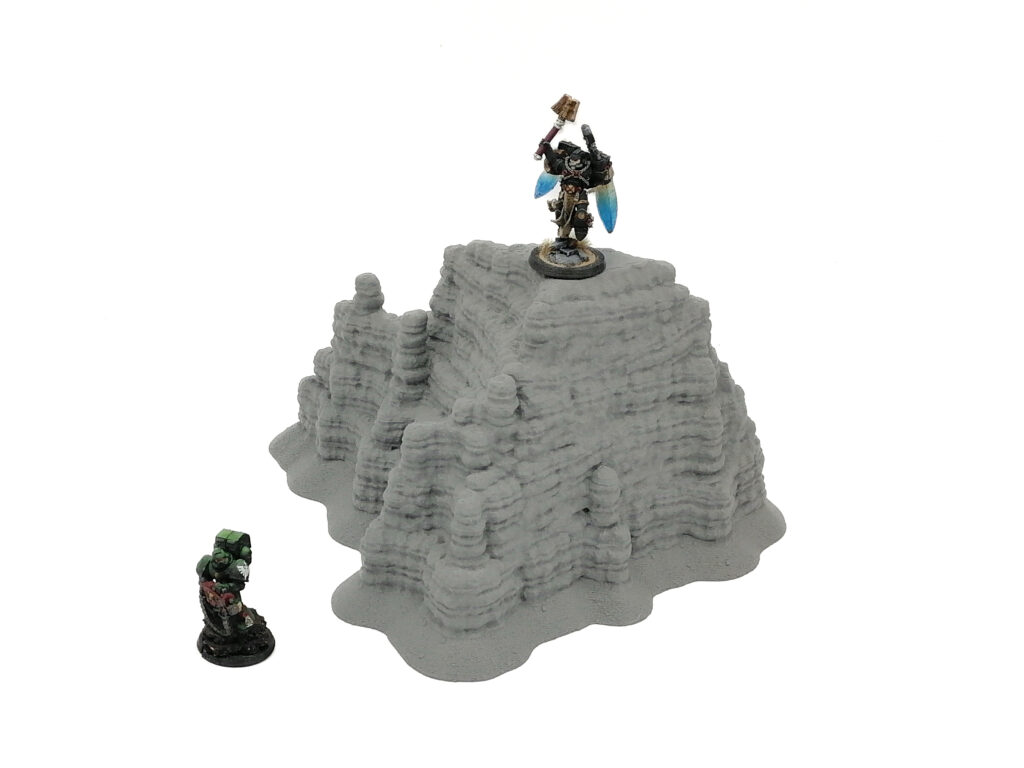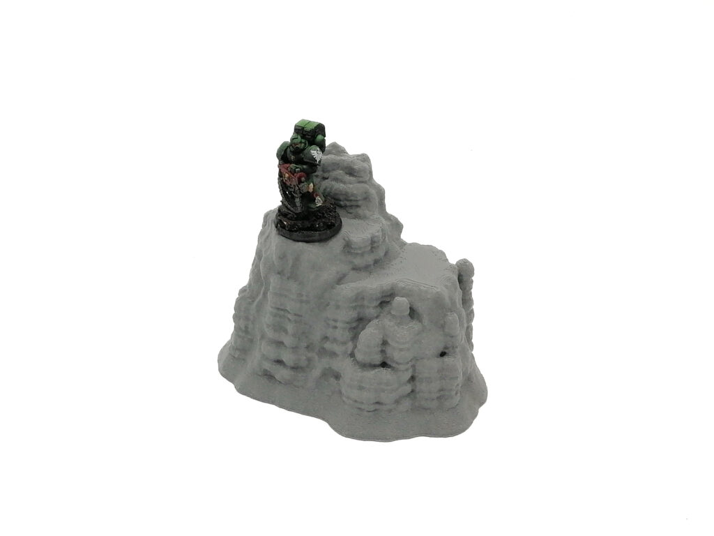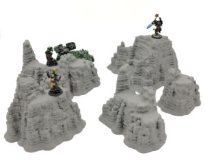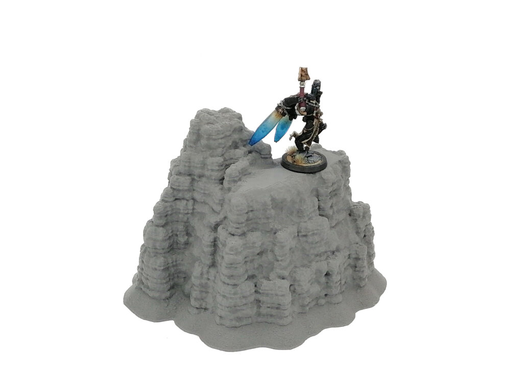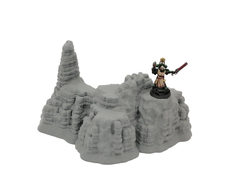 A selection of stratified rock formations as scenery and / or line of sight blocking terrain. Single parts no assembly required. Light and highly detailed.